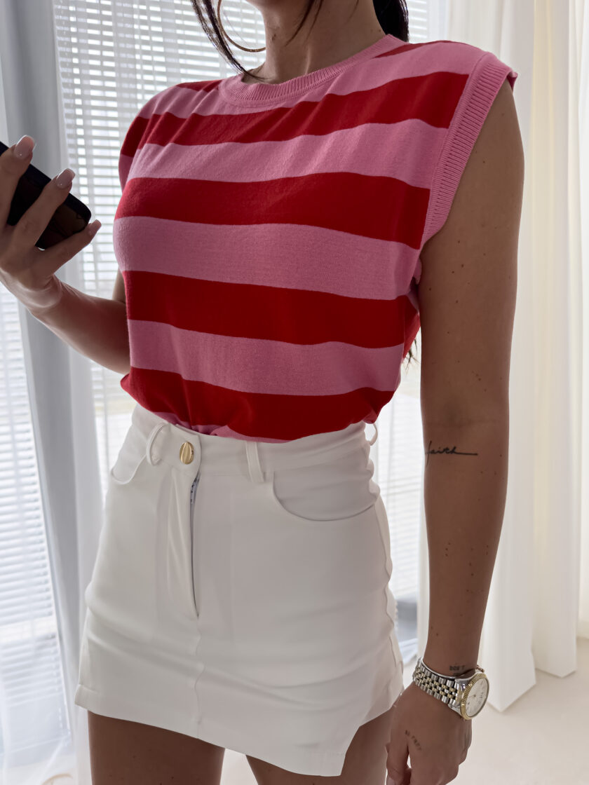 Krój bez rękawów sprawia, że top jest lekkim elementem stylizacji idealnym na cieplejsze dni lub do noszenia pod lekką kurtką czy marynarką w chłodniejsze wieczory. Poziome pasy dodają mu charakteru i modnego wyglądu, który świetnie sprawdza się w codziennych zestawach.